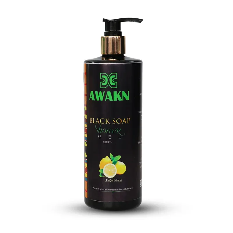 Awakn black soap shower gel – lemon mint Moisturises your skin and prevents hair breakage Perfect your skin beauty the natural way size : 500ml FDA Approved FDA/Co.20-4491