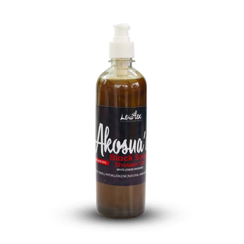 Made in Ghana natural black soap shower gel for all skin types Repairs the skin, removes white patches and dark spots Gives the skin an even tone.